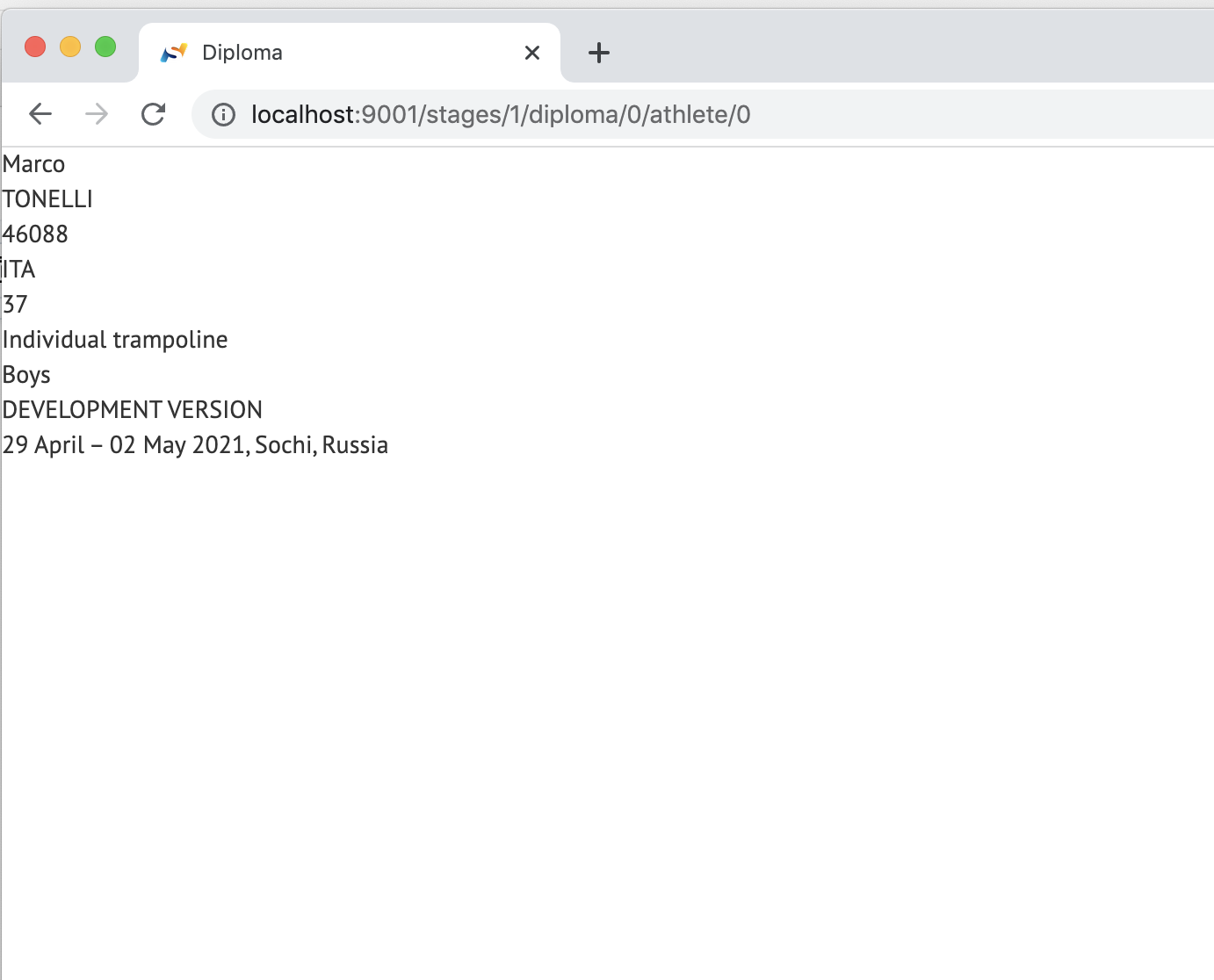 To enable diploma links you need to click the control link at the Stage level of the competition. Diploma links will appear next to the athlete names. Each link will provide the page with the athlete data that you can print on the pre-made background. It is possible to customize the displayed elements and their placements. Please read further to learn how to do it.